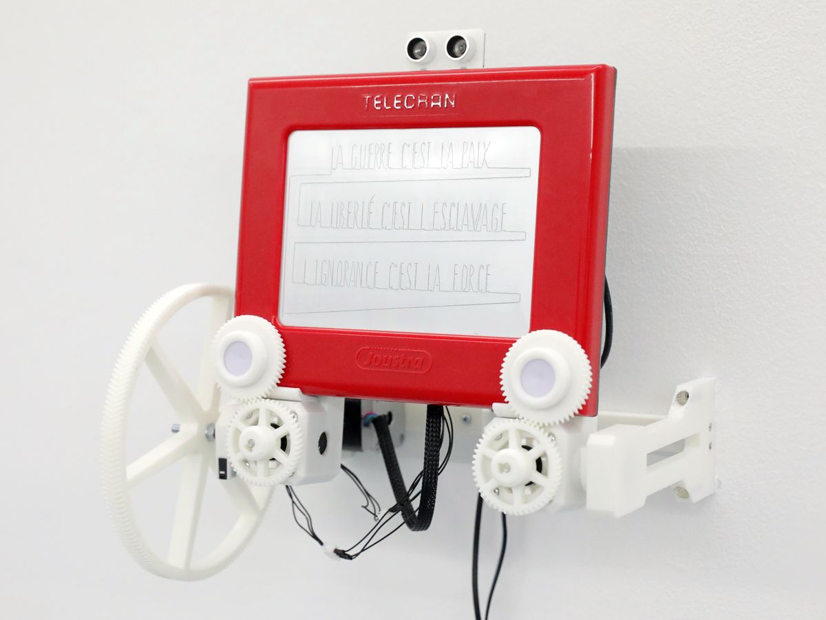 À l'instar de la notion de contrôle opérée par le Télécran dans le récit, le mécanisme de dessin est ici activé lorsque le·la spectateur·rice entre dans la zone de détection du capteur de présence en partie haute du dispositif. À la fin de la manoeuvre de dessin, le Télécran reste figé le temps nécessaire à la lecture de la phrase. Il bascule ensuite sur son axe pour retrouver un écran immaculé, lorsqu'enfin, les deux yeux noirs du capteur surveillent l'espace à l'affût des prochain·e·s spectateur·rice·s.