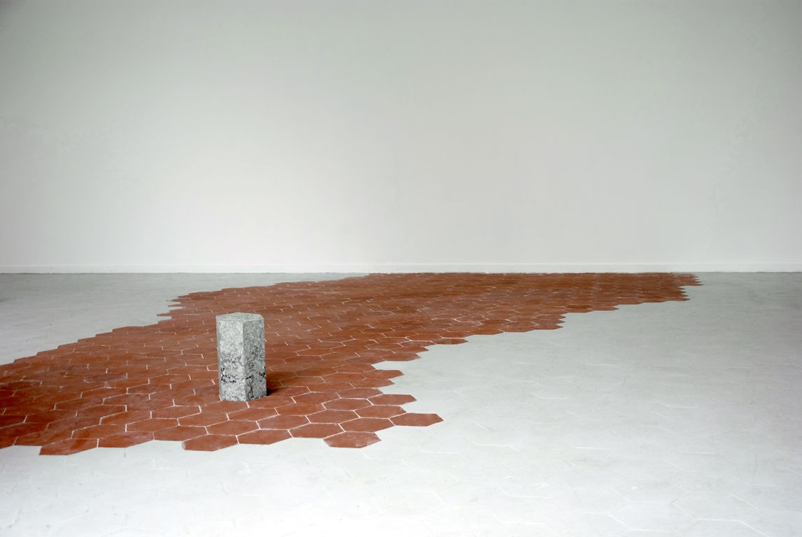 Sans Titre vise à démaquiller un white cube : Racler la peinture au sol pour en (re)découvrir partiellement l’aspect originel. La trame hexagonale du carrelage retrouvé devient base pour extruder une colonne. Celle‑ci est composée de la totalité des résidus générés en amont.