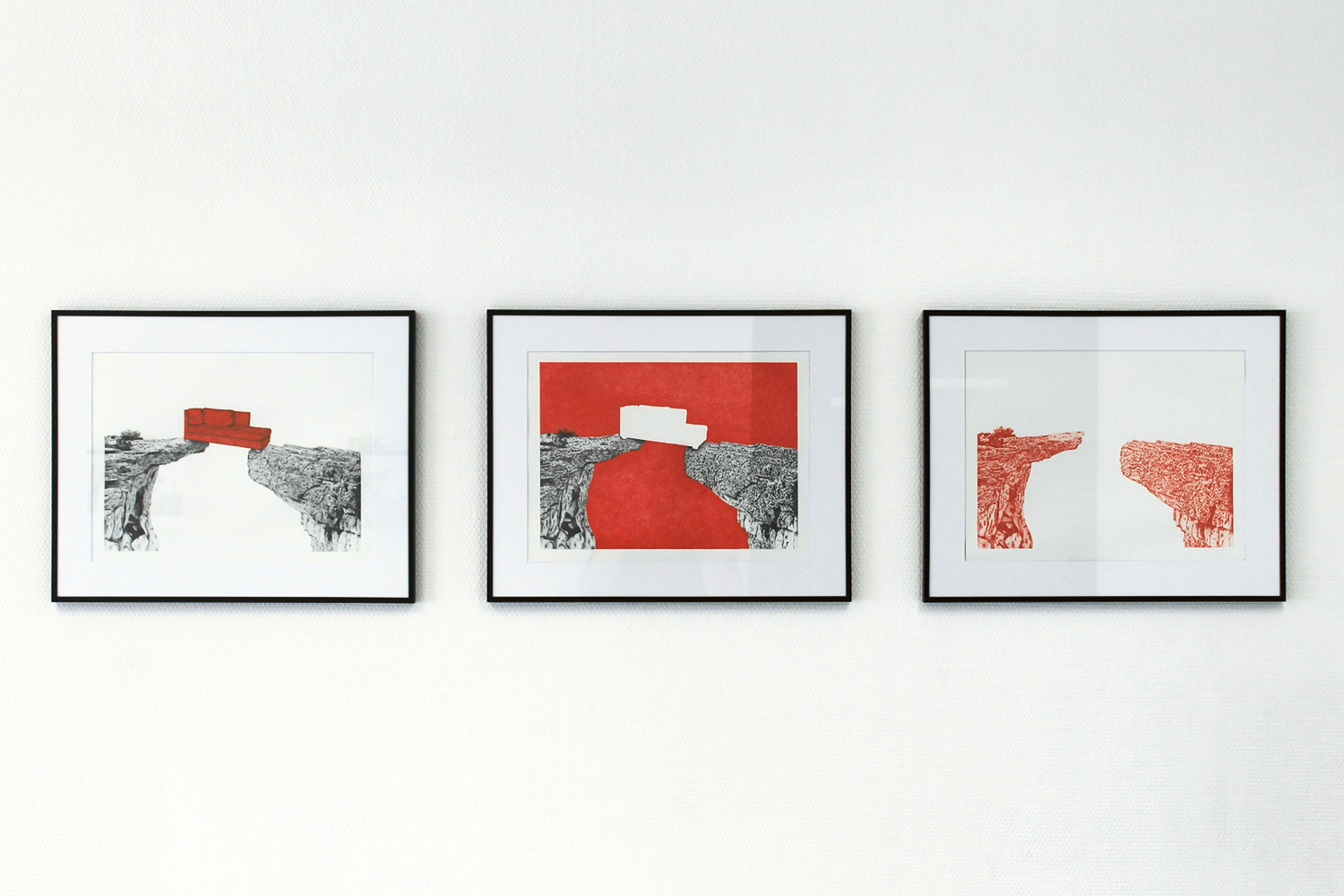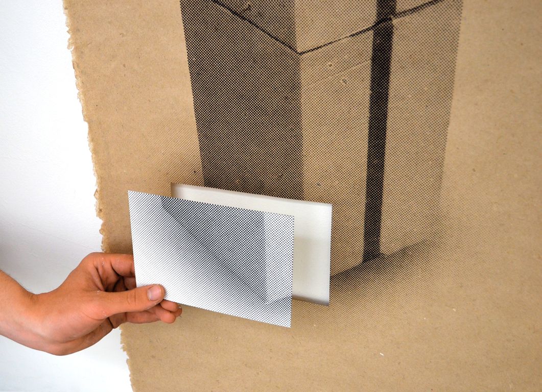 « Le dispositif d'Arthur Chiron déjoue la contrainte en réduisant les cartons à une image qui lui permet d'explorer les notions d'intégrité et d'identité de l'œuvre. Les deux cartons empilés sont photographiés, la photo est tirée en lithographie dans laquelle est découpée une fenêtre de dix centimètres sur quinze — format de l'estampe réalisée pour la tombola qui a financé l'exposition. Le fragment soustrait à la lithographie est apposé sur l'estampe produite pour la tombola. L'œuvre se trouve ainsi disséminée entre le lieu de l'exposition et les mains des gagnants de la tombola.»