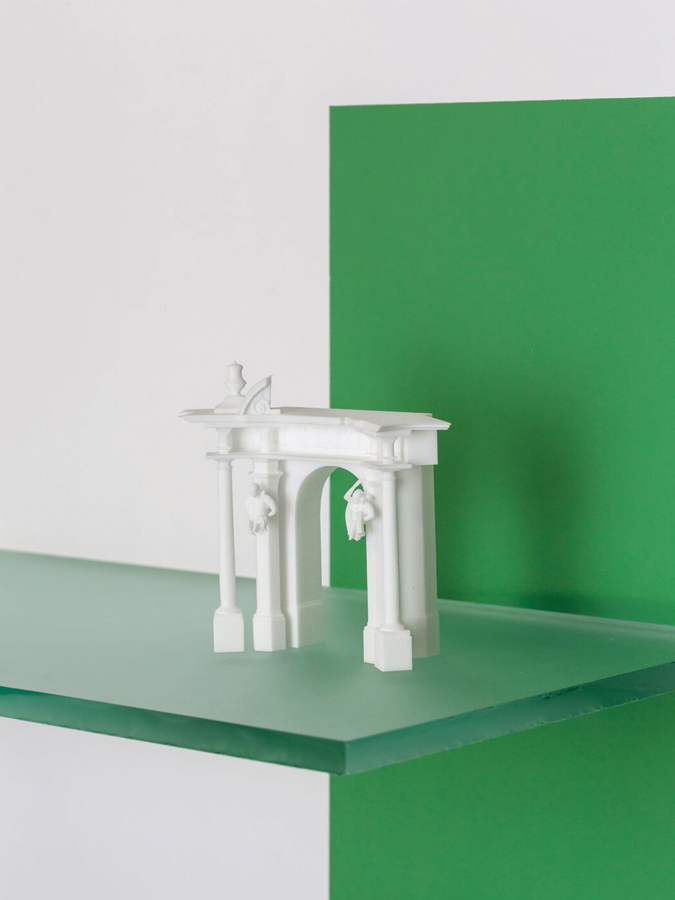 Ce choix établi par la banque centrale européenne suggère une notion de hiérarchie de valeur entre les différents styles architecturaux. 885 propose d’extraire ces architectures de la planéité des billets. Celles-ci sont modélisées numériquement puis produites sous forme de maquettes. Leur échelle est déterminée par le coût de matière première nécessaire à leur production. C’est ainsi que chaque sculpture est produite pour une valeur d’un septième de 885€ soit environ 126,43€. Ce protocole de mise à l’échelle tend à neutraliser le rapport de force entre ces sept courants architecturaux.